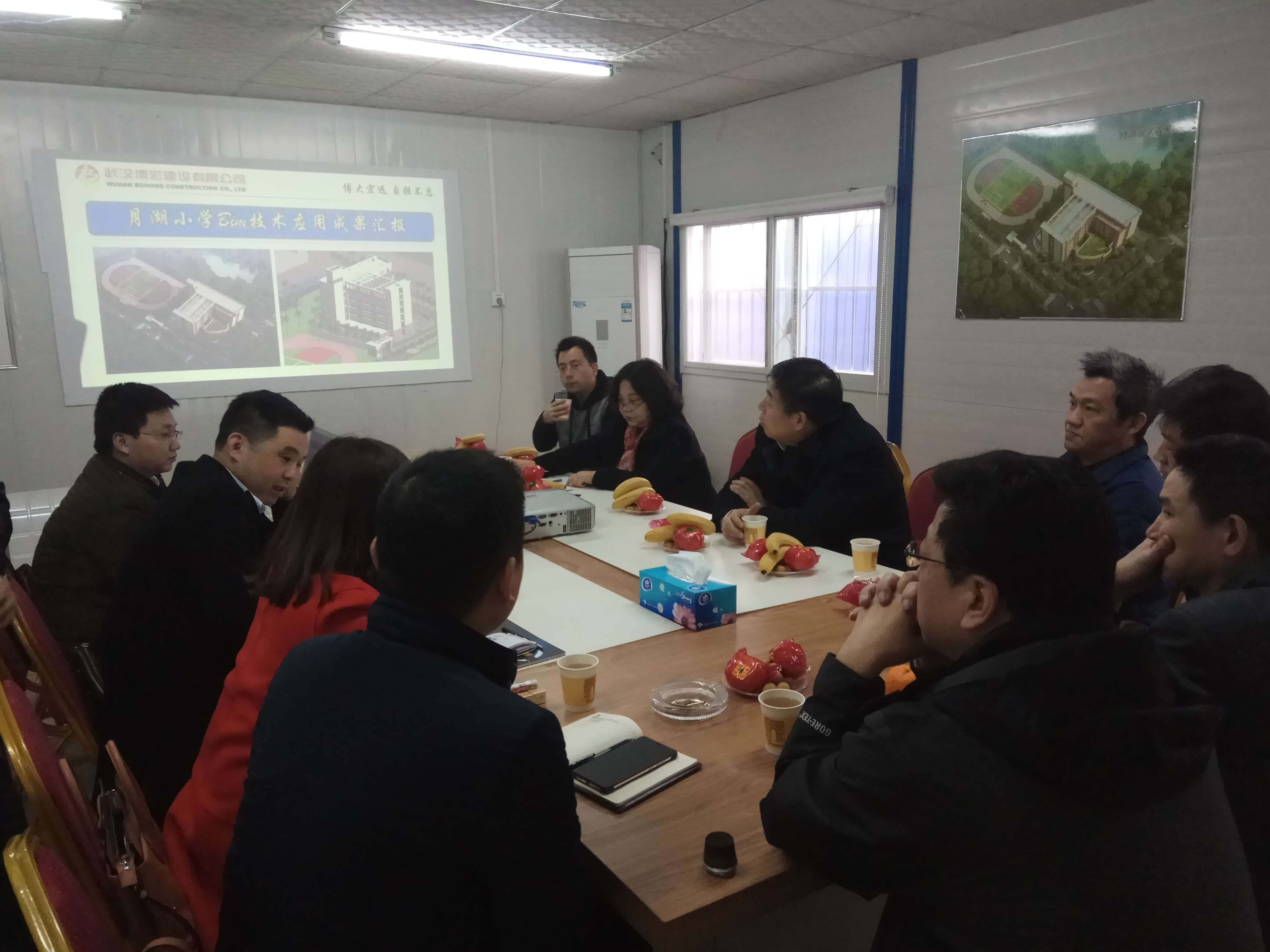 考察交流會議上為加強雙方了解,公司經(jīng)營副總蘇琦首先就公司近年來發(fā)展及資質(zhì)情況進行了簡單介紹。接下來公司副總工程師梅浩對BIM技術(shù)在月湖小學(xué)施工建設(shè)中取得的效果進行了概述??偣まk文志勇從圖紙審查、碰撞檢查、可視化交底、砌體排磚、進度質(zhì)量安全管理、施工模擬等多個方面一一介紹BIM技術(shù)為月湖小學(xué)工程建設(shè)帶來的成果及效益,總結(jié)了BIM技術(shù)應(yīng)用經(jīng)驗,并簡單介紹了下一步BIM應(yīng)用計劃安排。