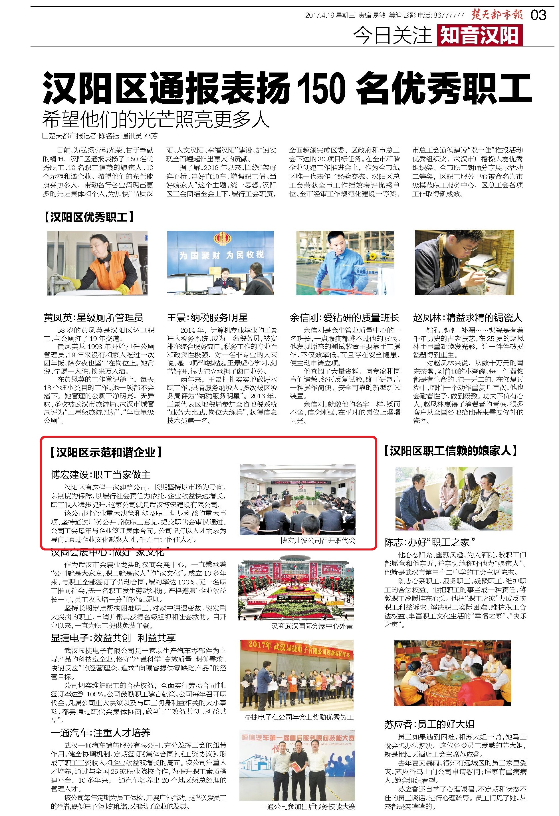 2017年4月19日,楚天都市報(bào)知音漢陽(yáng)板塊報(bào)道了漢陽(yáng)區(qū)示范和諧企業(yè)獲獎(jiǎng)情況,其中我公司博宏建設(shè)名列首位。