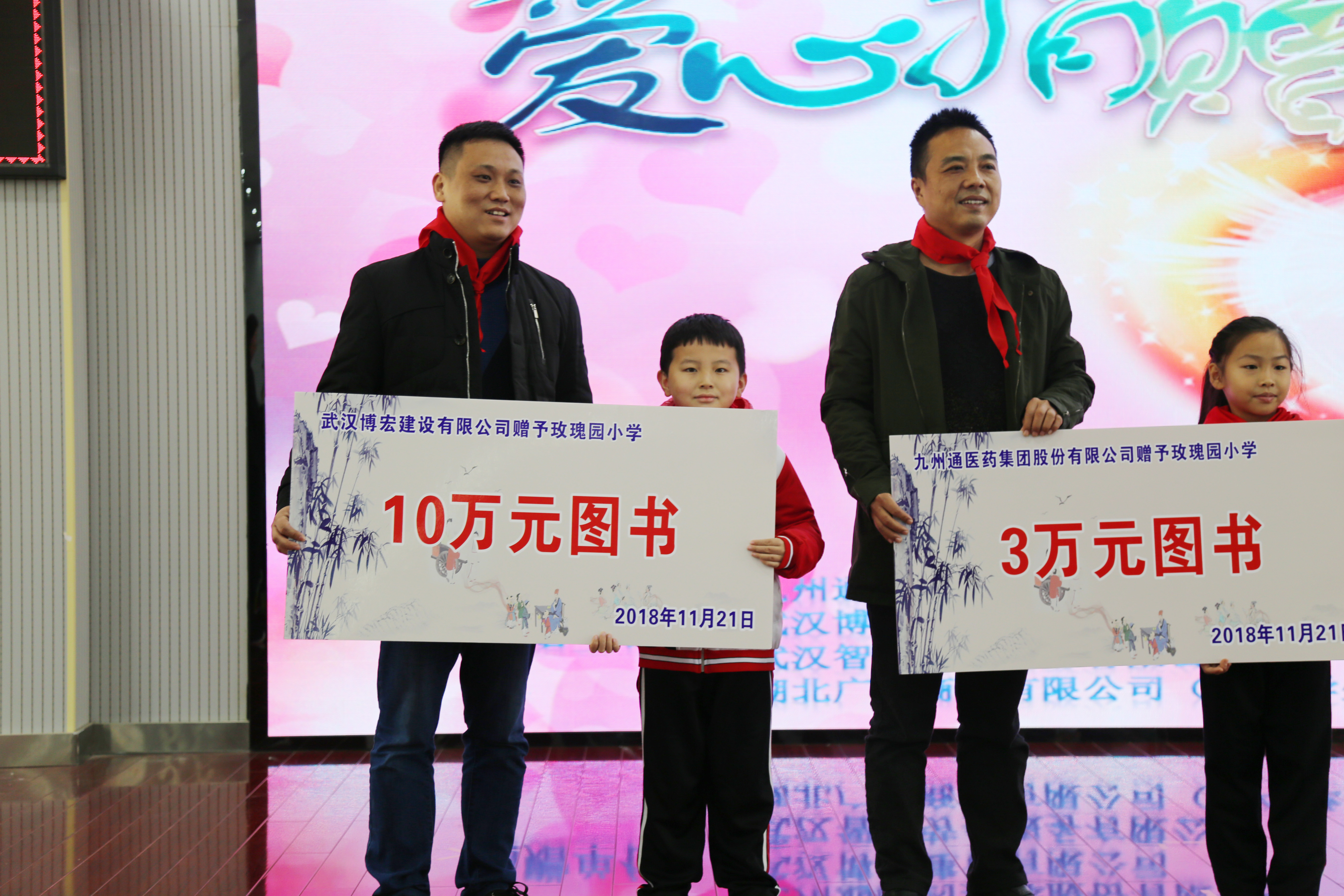 “愛心捐贈,助力前行”,1121日上午,漢陽區玫瑰園小學芳草校區圖書捐贈儀式在該校報告廳舉行,漢陽區工商聯副主席張蓮莉,區教育局副局長李兵,區房管站副站長陳衛琴、魏慧民,玫瑰園小學校長黃智玲,武漢博宏建設有限公司黨支部副書記郭一清、副總經理蘇琦,武漢智誠勞務服務有限公司總經理劉春濤以及九州通醫藥集團股份有限公司、湖北廣惠商貿有限公司等單位代表出席捐贈儀式。為助力推進漢陽區教育事業,豐富學校圖書庫存,博宏建設現場為該校捐獻了價值10萬元的圖書。
