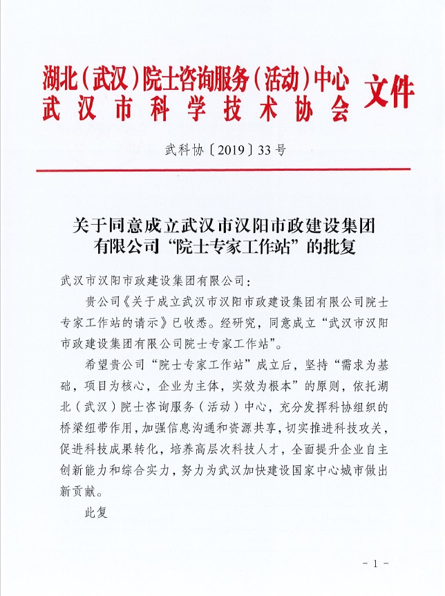 2019520日,湖北(武漢)院士咨詢服務(wù)(活動(dòng))中心、武漢市科學(xué)技術(shù)協(xié)會(huì)正式批復(fù)同意成立武漢市漢陽市政建設(shè)集團(tuán)有限公司院士專家工作站。