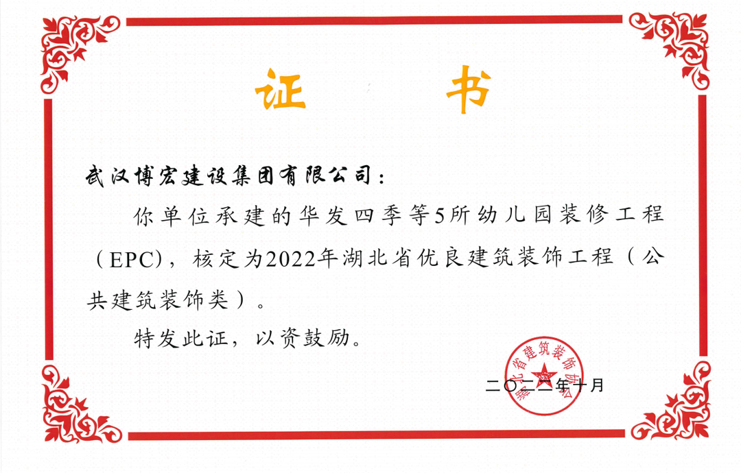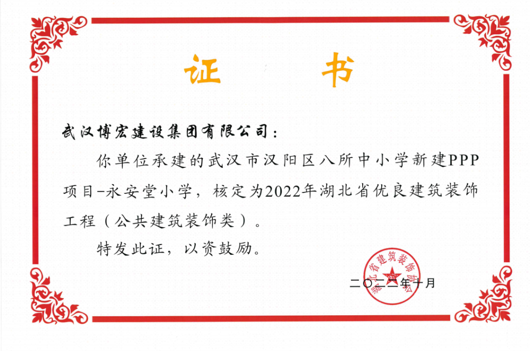 近日,湖北省建筑裝飾協會發布了《關于開展2022年湖北省建筑裝飾工程質量目標考核工作的通知》,由博宏建設集團承建的華發四季等5所幼兒園裝修工程(EPC)、新城陽光國際廣場C地塊商業裙樓改造工程(1#、2#裙樓)、新城陽光國際廣場D地塊商業裙樓改造工程(D座裙樓)、武漢市漢陽區八所中小學新建PPP項目-永安堂小學被核定為“2022年湖北省優良建筑裝飾工程(公共建筑裝飾類)”。