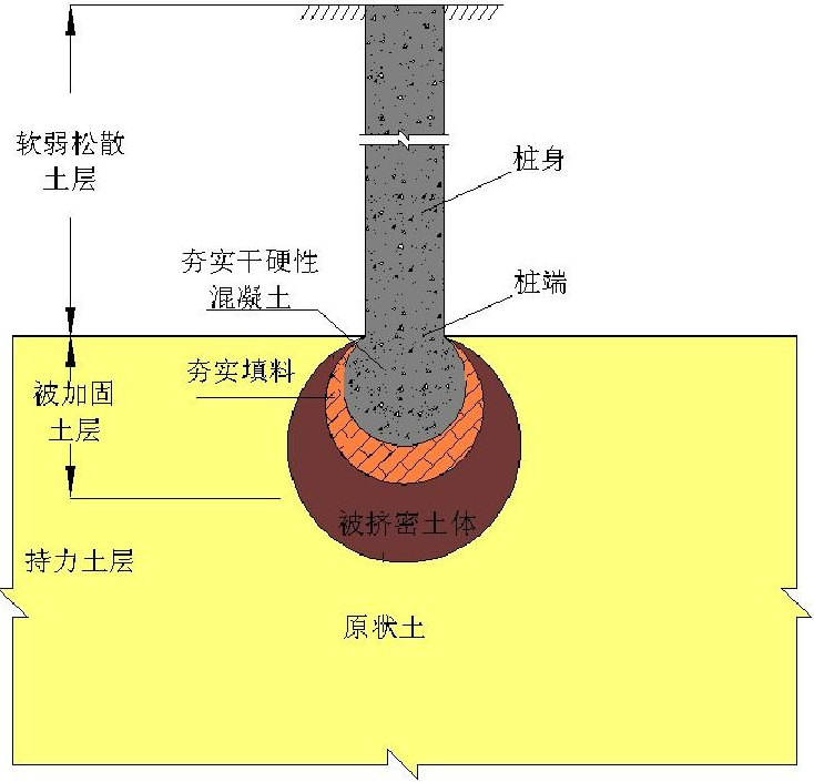 “載體樁”由上部樁身和下部“復合載體”兩部分組成。樁身一般為現(xiàn)澆鋼筋混凝土結構,“復合載體”是位于樁端底部、經深層填料夯實的復合體。