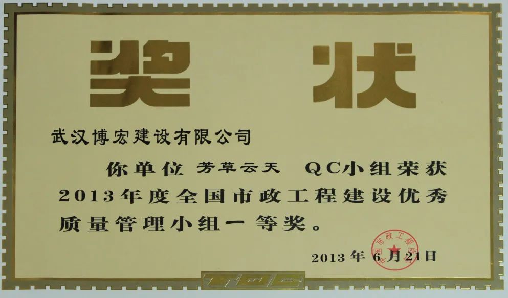芳草云天QC小組成立于2011年5月31日,本小組從企業(yè)經(jīng)營戰(zhàn)略、方針目標(biāo)和現(xiàn)場存在的問題出發(fā),以提高效能、降低消耗、實(shí)現(xiàn)經(jīng)濟(jì)與社會(huì)效益雙贏為目的,全面優(yōu)化項(xiàng)目質(zhì)量。歷年來追求卓越、探索新品,曾獲得2013 年全國市政工程建設(shè)協(xié)會(huì)優(yōu)秀QC成果一等獎(jiǎng)、2014年湖北省市政工程建設(shè)優(yōu)秀QC成果二等獎(jiǎng)、2015年湖北省市政工程建設(shè)優(yōu)秀 QC成果一等獎(jiǎng)、2022年度中國施工企業(yè)管理協(xié)會(huì)工程建設(shè)質(zhì)量管理小組活動(dòng)成果二等獎(jiǎng)、2022年中國建筑業(yè)工程建設(shè)質(zhì)量管理小組活動(dòng)成果三等獎(jiǎng)等榮譽(yù)。