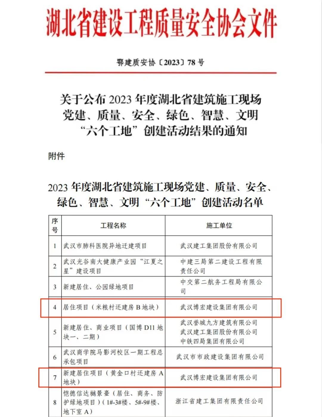 近日,湖北省建設工程質量安全協會公布了2023年度湖北省建筑施工現場黨建、質量、安全、綠色、智慧、文明“六個工地”評比結果名單,由博宏建設集團承建的居住項目(米糧村還建房B地塊)新建居住項目(黃金口村還建房A地塊)喜獲殊榮。